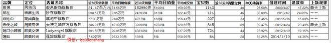 我們在進行歸納總結(jié)下,整理如下:從品牌 、定位、 店鋪名稱、近30天銷售額 、平均日銷售額、近30天銷量 、平均日銷量、平均成交價 、寶貝數(shù) 、近30天0銷量寶貝 、30天動銷率創(chuàng)建時間 、退款率、 上新規(guī)律、上新規(guī)律點最新新品  數(shù)據(jù)結(jié)論: