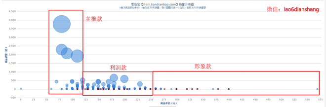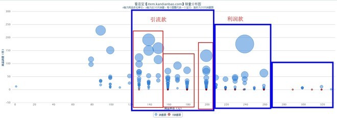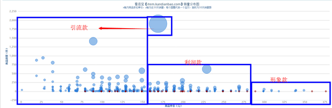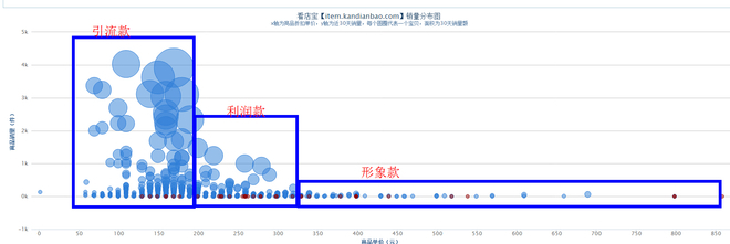 裂帛服飾旗艦店:  豎軸y軸:銷售件數(shù);橫軸x軸:價位;x軸為商品折扣單價,y軸為近30天銷量,每個圓圈代表一個寶貝,面積為30天銷售額;圈圈越大說明最大銷售越大。圖中可得,裂帛服飾旗艦店主打100-200元;引流款:50-150;利潤款:150-300;形象款:300-850。