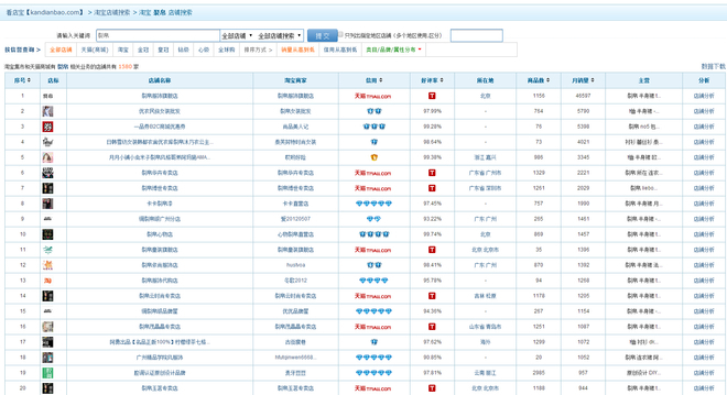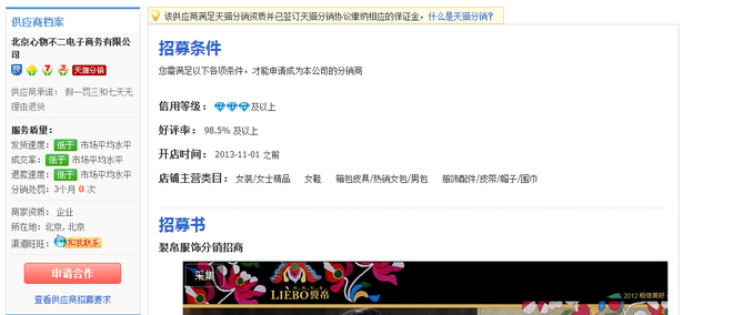 這個時候,我們可以進gongxiao.tmall.com  具體內(nèi)容,我們就看圖了,我們再來分析下,裂帛有多少家分銷,根據(jù)數(shù)據(jù)顯示。淘寶集市和天貓商城有 裂帛 相關(guān)業(yè)務的店鋪共有 1580 家。  天貓一共有20家  分析完淘內(nèi),我們再來分析裂帛分別進駐了什么平臺。自己有官方網(wǎng)站平臺銷售,還進駐包括拍拍、一號店、京東、當當。