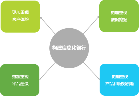 隨著互聯網金融的興起和發(fā)展,大數據時代的到來,商業(yè)銀行面臨著支付脫媒、融資脫媒、信息脫媒等多種挑戰(zhàn),同時也為商業(yè)銀行的轉型發(fā)展提供了機遇。借助新興互聯網金融發(fā)展模式,商業(yè)銀行不斷進行互聯網化發(fā)展探索和創(chuàng)新,發(fā)揮自身資金雄厚、風控完善、信譽度高等優(yōu)勢,從流程、數據、平臺和產品等層面系統推進信息化銀行建設,從而構建面向未來的、可持續(xù)的發(fā)展模式。主要表現在以下四個方面: