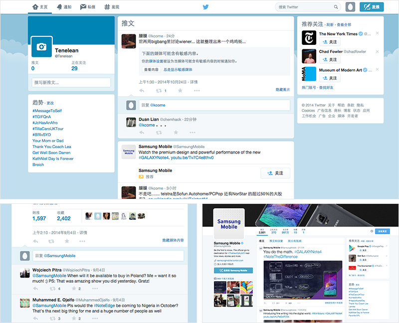 整體藍(lán)色設(shè)計帶來統(tǒng)一印象,顏色的深淺分別承載不同類型的內(nèi)容信息,比如信息內(nèi)容模塊,白色底代表用戶內(nèi)容,淺藍(lán)色底代表回復(fù)內(nèi)容,更深一點的藍(lán)色底代表可回復(fù)操作,顏色主導(dǎo)著信息層次,也保持了twitter的品牌形象。