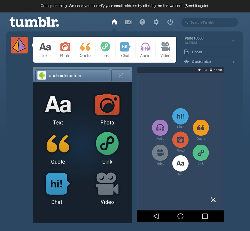 在實際的設(shè)計運用中,常會用些更綜合的手法,例如整體有主導(dǎo)色調(diào),小范圍布局會采用同色調(diào)搭配。拿tumblr的發(fā)布模塊來說,雖然頁面有自己的主色調(diào),但小模塊使用同色調(diào)不同色彩的功能按鈕,結(jié)合色相變化和圖形表達(dá)不同的功能點,眾多的按鈕放在一起,由于同色調(diào)原因模塊非常穩(wěn)定統(tǒng)一。