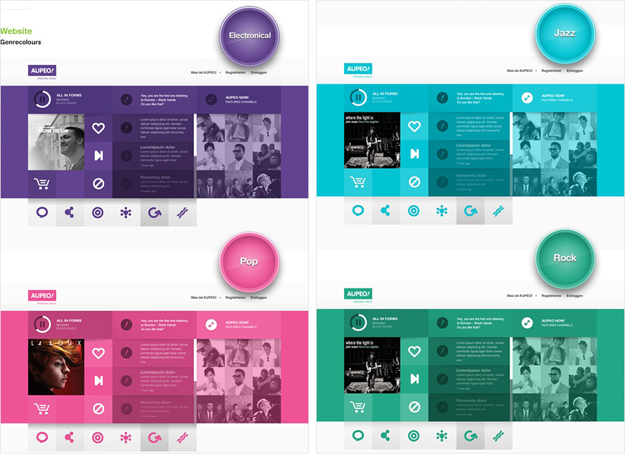 拿紫色界面來說,利用同一色相通過色調(diào)深淺對比,營造頁面空間層次。雖然色彩深淺搭配合理,但有些難以區(qū)分主次,由于是同一色相搭配,顏色的特性決定著心理感受。