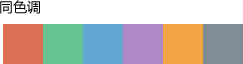 這是由同一或類似色調(diào)中的色相變化構(gòu)成的配色類型,與主導(dǎo)色調(diào)配色中的屬于同類技法。區(qū)別在于色調(diào)分布平均,沒有過深或過淺的模塊,色調(diào)范圍更為嚴(yán)格。