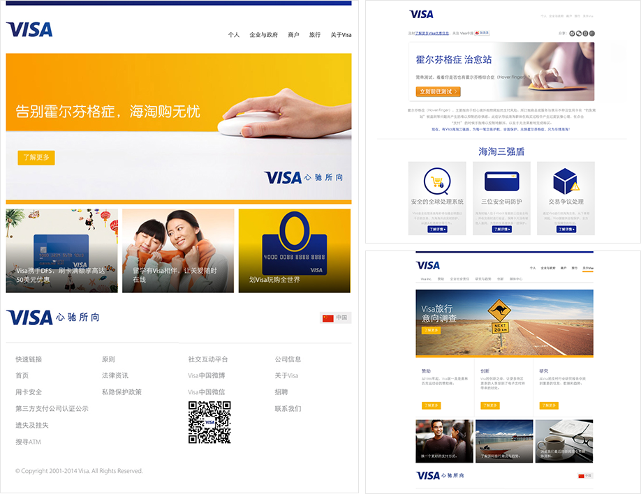 VISA是一個信用卡品牌,深藍(lán)色傳達(dá)和平安全的品牌形象,黃色能讓用戶產(chǎn)生興奮幸福感。另外藍(lán)色降低明度后再和黃色搭配,對比鮮明之余還能緩和視覺疲勞。
