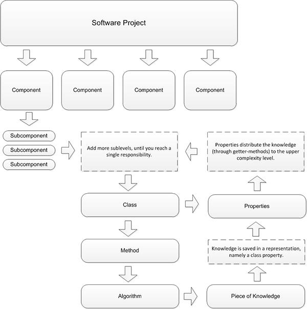 組件還可以往下再分,這樣復(fù)雜性將被降低到單一職責(zé)(single responsibility),每個(gè)職責(zé)可以使用一個(gè)類來(lái)實(shí)現(xiàn),類包含了方法和屬性。方法實(shí)現(xiàn)算法,這些算法和算法的子部分是構(gòu)成軟件業(yè)務(wù)邏輯的最小知識(shí)塊。你只需要保證這些塊不重復(fù)即可。